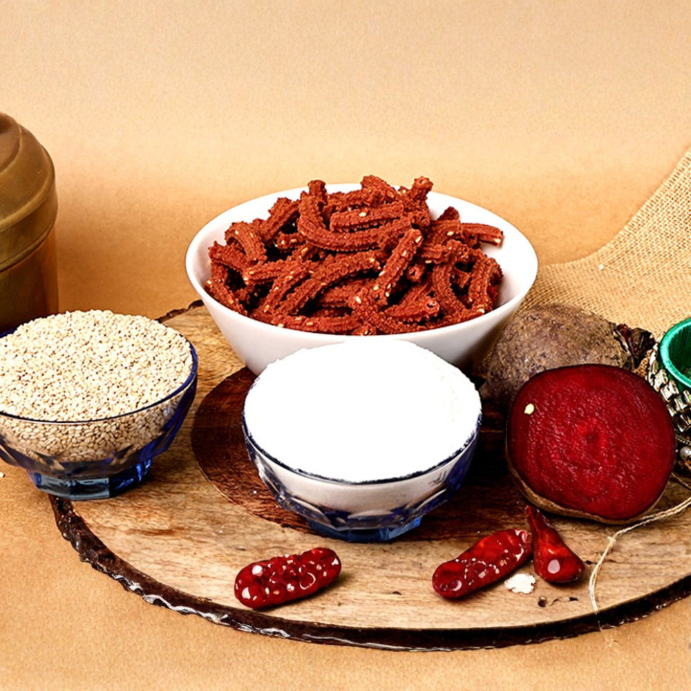 Brighten your snack time with our Beetroot Murukku, a delightful twist on a beloved South Indian classic. These vibrant pink spirals are infused with the goodness of fresh beetroot, offering a subtly sweet and earthy flavour that perfectly complements the traditional crunchy texture. It’s a festive treat and a healthy everyday snack, bringing a joyful splash of colour and a wholesome taste reminiscent of grandmother’s kitchen, where creativity met tradition to delight everyone.