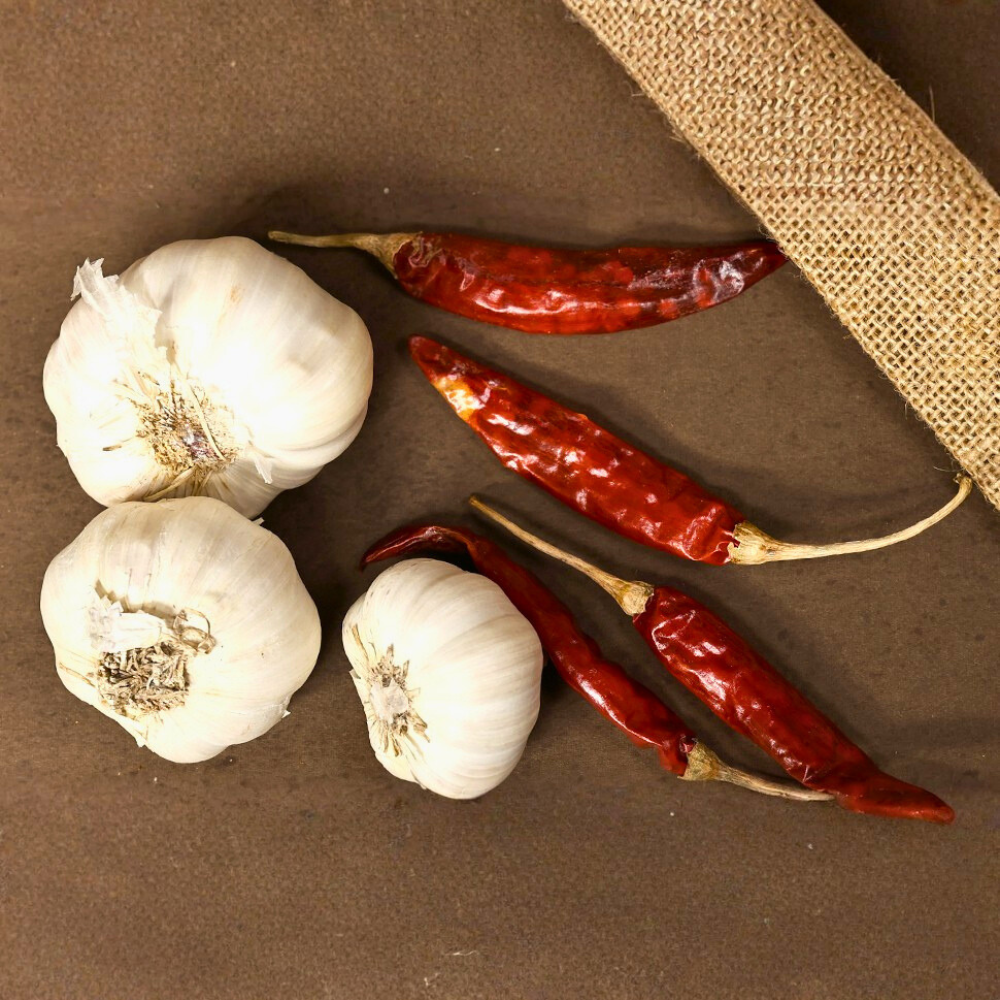 We source the indigenous Desi variety from farms surrounding Hyderabad. These small cloves are highly pungent and retain their strong flavor even after roasting, giving podis a robust savory kick.