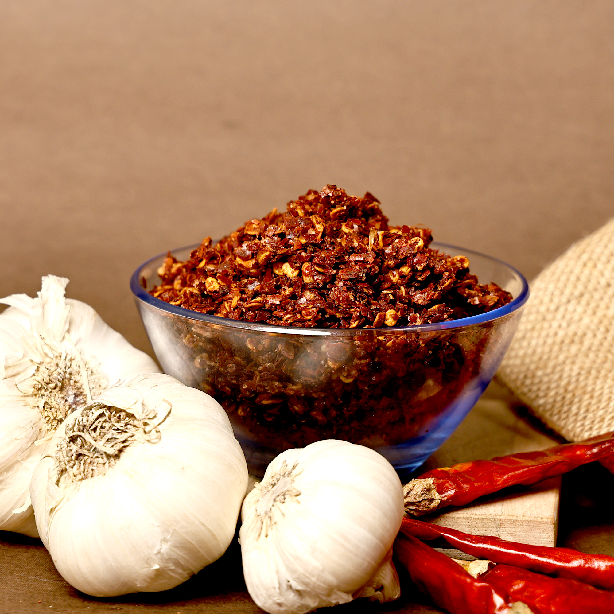 Ah, my dear Vellulli Mirapakaya Flakes, our Garlic Chilli Flakes! This is a simple yet powerfully flavourful podi, just like we make it in Amalapuram. We use generous amounts of fresh Garlic, fiery Red Chilli, and a touch of Salt. Each ingredient is carefully selected and prepared to give you that wonderful roasted garlic chilli flakes taste, a true homemade Andhra treat.