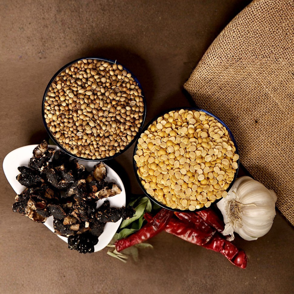 Ingredients: Toor dal, chana dal, tamarind, cumin, curry leaf, red chili, salt.