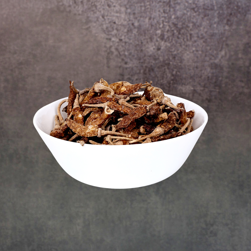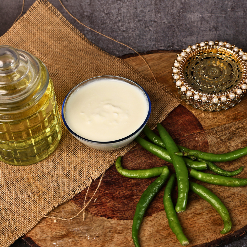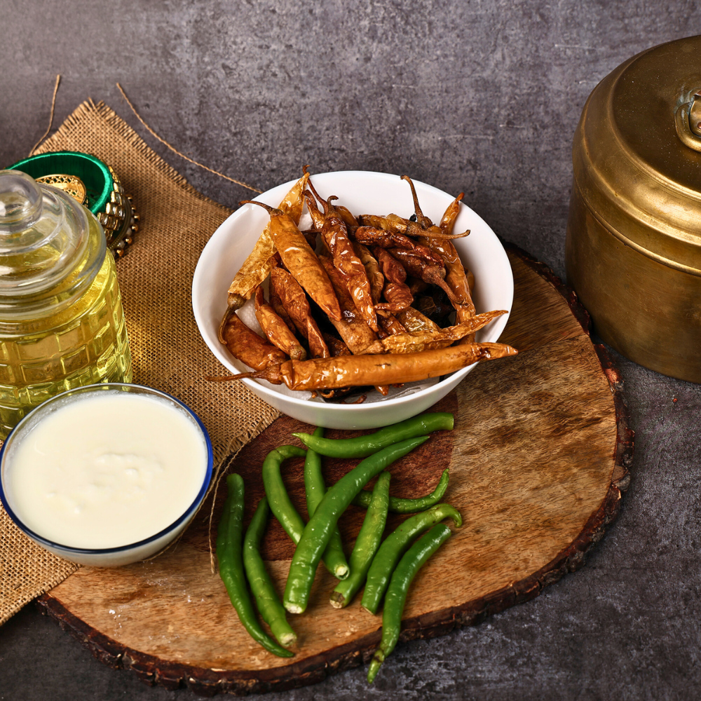 G4 chillies are chosen for their thick skin and high pungency. When ground into the batter, they provide a fresh, herbaceous heat that complements the tanginess of curd-based fryums.