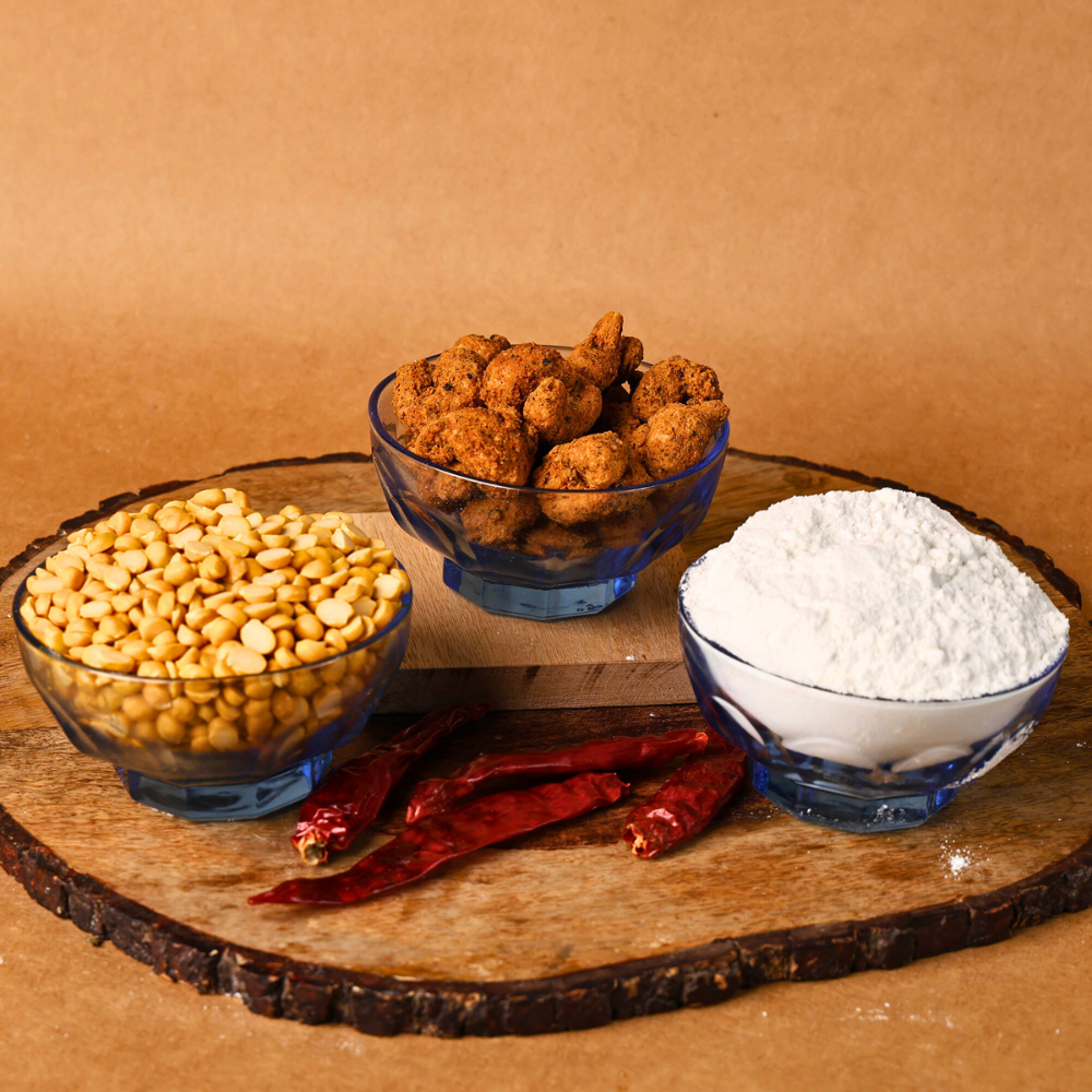 An adjusted version of our pickle blend, finer ground to coat chips and sev evenly. It focuses more on color (Warangal) and moderate heat (Guntur) so kids and adults alike can enjoy the snacks.