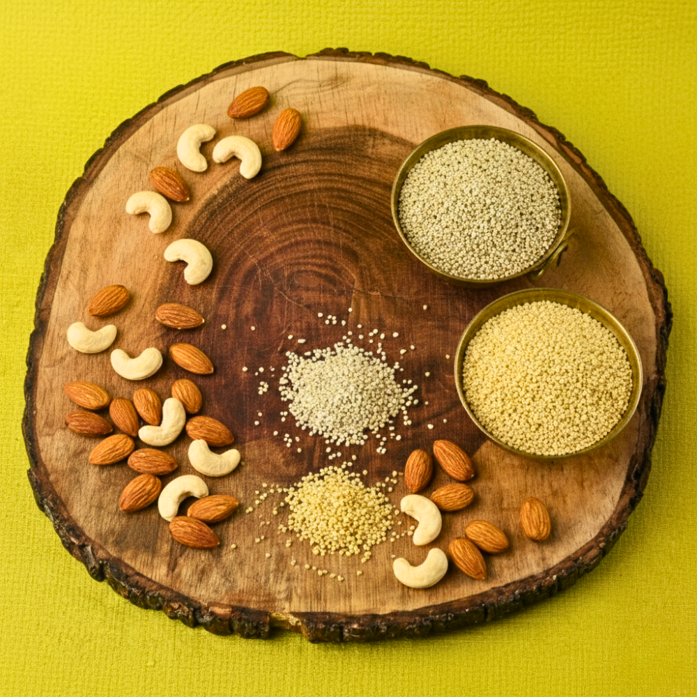 “Introducing The Pickle Story’s Millet Health Mix – your daily dose of natural protein and energy. This homemade blend combines fiber-rich Kodo & Pearl Millets with protein-packed Green Gram & Roasted Gram. Finished with the richness of Almonds & Cashews, it is 100% preservative-free and natural.