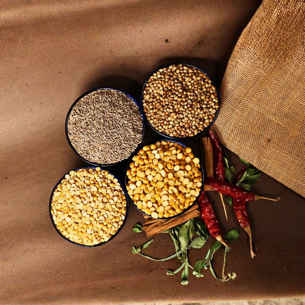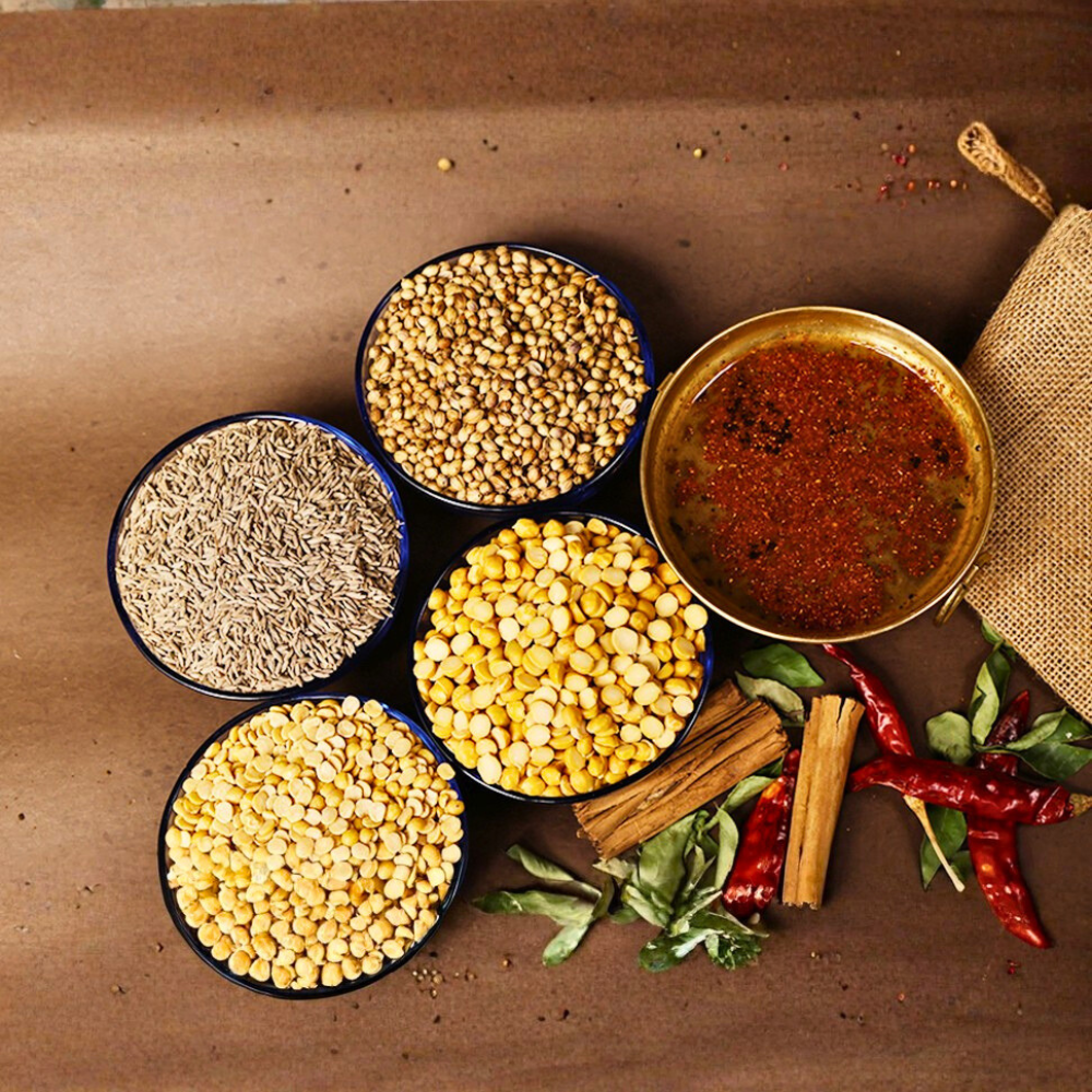 Our Rasam Podi is meticulously prepared, starting with the finest hand-picked whole spices. These are carefully dry-roasted to unlock their full flavour and then freshly stone-ground into a fine, fragrant powder. We ensure absolute purity: there are no preservatives, no chemicals, no artificial colours or fillers. Made in small batches to guarantee freshness and potency, every pack adheres strictly to FSSAI and GMP certified standards, ensuring quality and safety in every sprinkle.