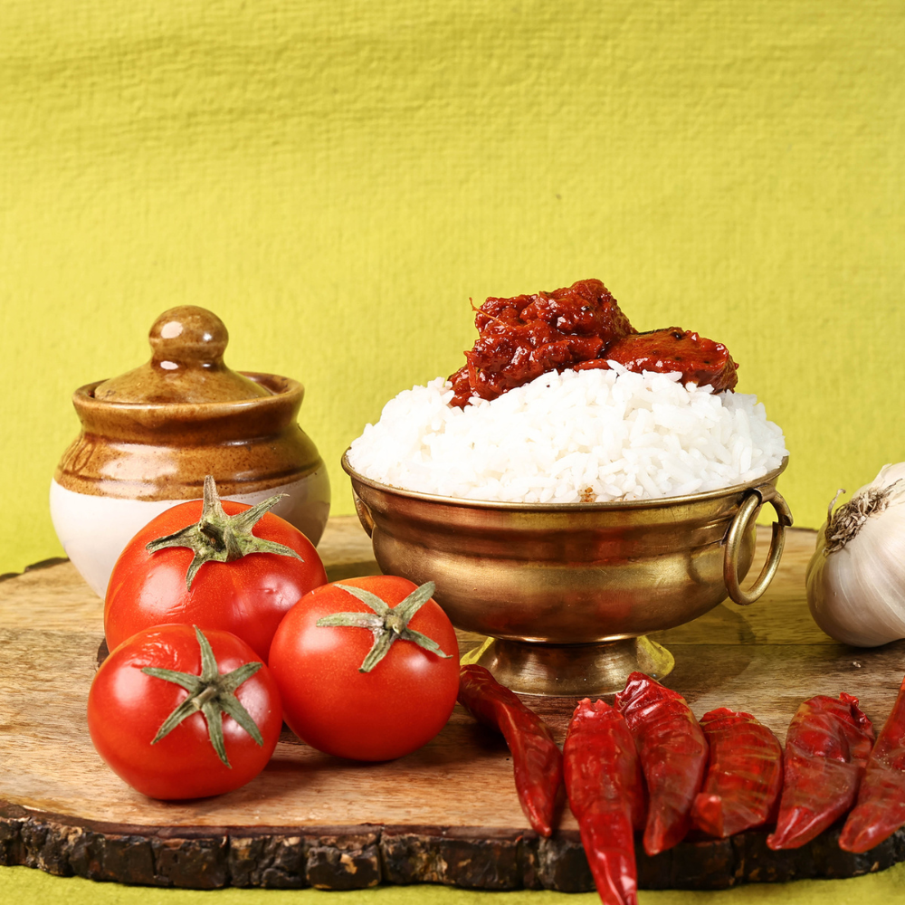 Tomato Pickle, a staple South Indian condiment particularly from Andhra Pradesh and Tamil Nadu regions, is made by cooking ripe tomatoes with tamarind for tanginess, red chili powder for heat, and tempering spices like mustard seeds, fenugreek, garlic, curry leaves, and asafoetida in generous amounts of sesame or gingelly oil. This spicy, tangy, and aromatic preserve develops a thick, oil-coated texture after simmering until the oil separates, making it shelf-stable for weeks when stored in an airtight jar. It pairs perfectly as a side with rice, curd rice, idli, dosa, or chapati, offering a bold flavor boost to everyday meals.